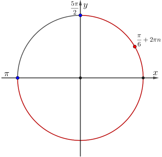 \(\displaystyle \pi\leqslant \frac{\pi}{6}+2\pi n \leqslant \frac{5\pi}{2}{ \small .}\)