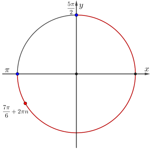 Таким образом, уравнение \(\displaystyle \sin(x)=-\frac{1 }{2}\) на отрезке \(\displaystyle \left[\pi;\, \frac{5\pi}{2}\right]\) имеет решения \(\displaystyle \frac{7\pi}{6}\) и \(\displaystyle \frac{11\pi}{6}{\small .}\)