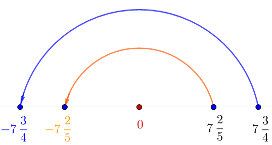 Теперь отразим зеркально \(\displaystyle 7\frac{2}{5} \) и \(\displaystyle 7\frac{3}{4} \) относительно нуля: