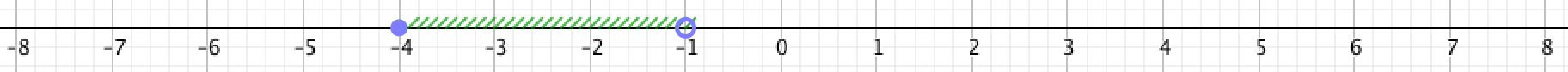 На рисунке выделены все точки между \(\displaystyle -4\) и \(\displaystyle -1{\small , } \) включая \(\displaystyle -4 \) и не включая \(\displaystyle -1{\small : } \)