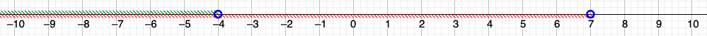 \(\displaystyle \left\{ \begin{aligned} \color{red}{x}&<\color{red}{7}{\small , }\\\color{green}{x}&<\color{green}{ -4}{\small . } \end{aligned} \right. \)