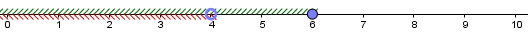 \(\displaystyle \left\{\begin{aligned}x&< 4{ \small ,}\\x&\le 6{\small .}\end{aligned}\right.\)