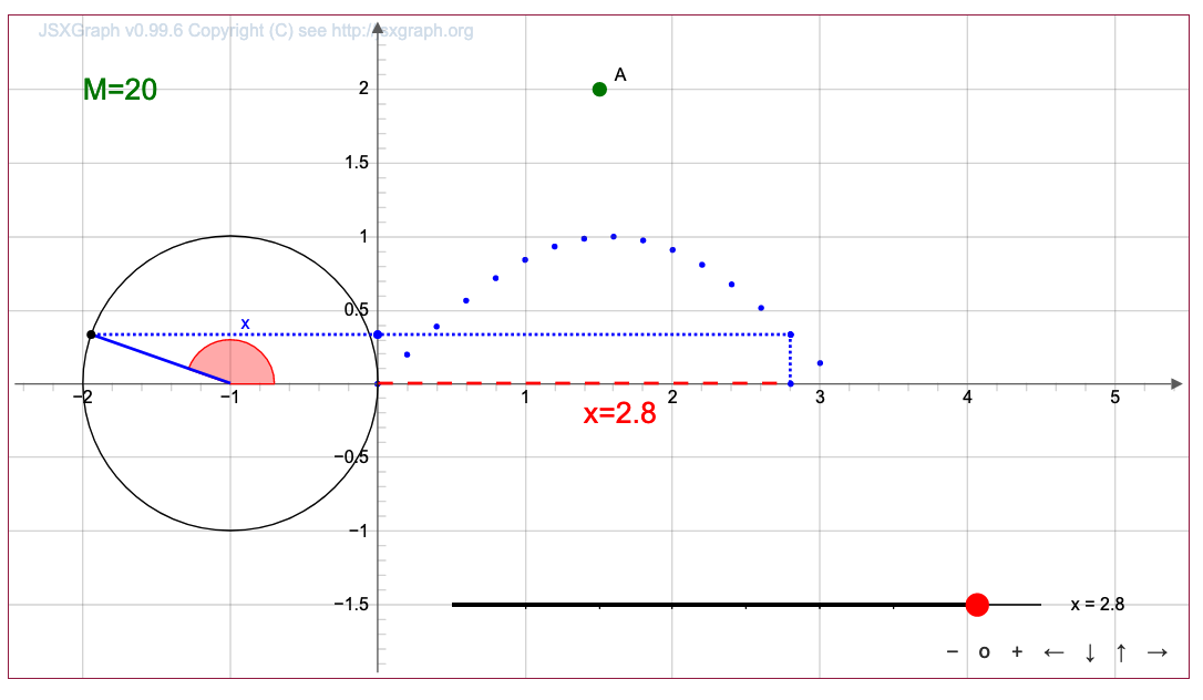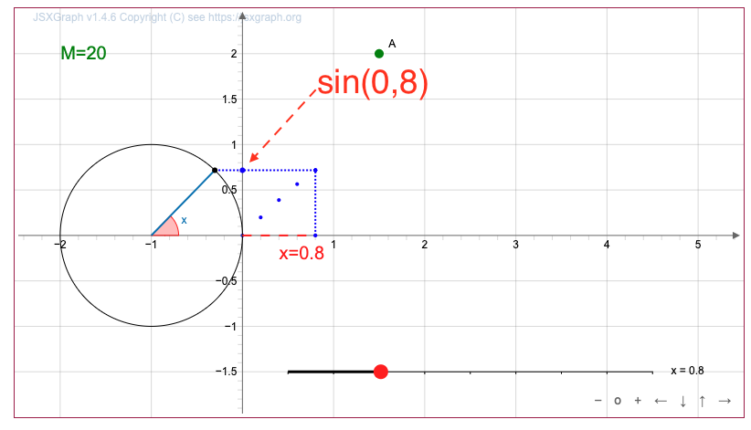 Если ползунок находится в положении \(\displaystyle x=0{,}8{ \small ,}\) получаем синюю точку с координатами \(\displaystyle (0{,}8;\,\sin(0{,}8)){\small .}\)