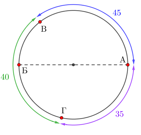 На кольцевой дороге расположено четыре бензоколонки: \(\displaystyle А{ \small ,}\, Б{ \small ,}\, В\)и\(\displaystyle Г{\small .}\) Расстояние между \(\displaystyle А\) и \(\displaystyle Б\) – \(\displaystyle 60\) км, между \(\displaystyle А\) и \(\displaystyle В\) – \(\displaystyle 45\) км, между \(\displaystyle В\) и \(\displaystyle Г\) – \(\displaystyle 40\) км, между \(\displaystyle Г\) и \(\displaystyle А\) – \(\displaystyle 35\) км (все расстояния измеряются вдоль кольцевой дороги по кратчайшей дуге).