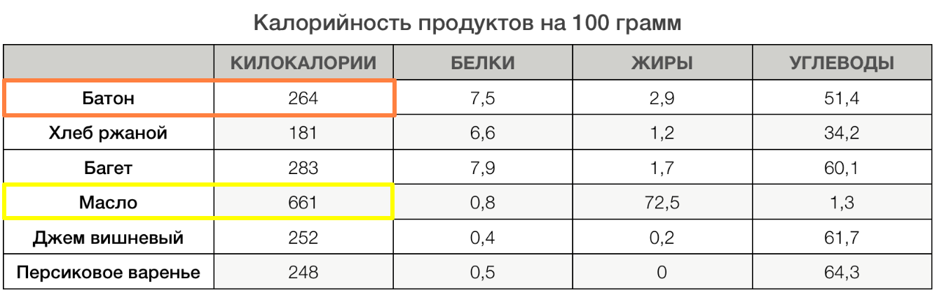 Таким образом, калорийность бутерброда \(\displaystyle 95{,}04+99{,}15=194{,}19\) ккал.