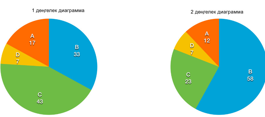 Бұл дөңгелек диаграммаларда үлестердің келесі үлестірілімі орын алады: