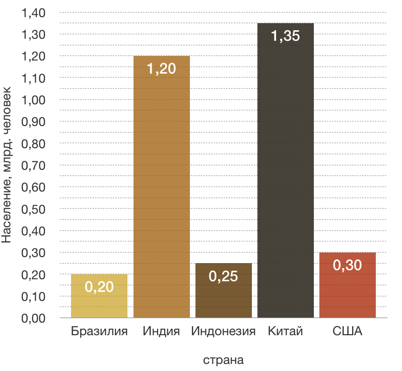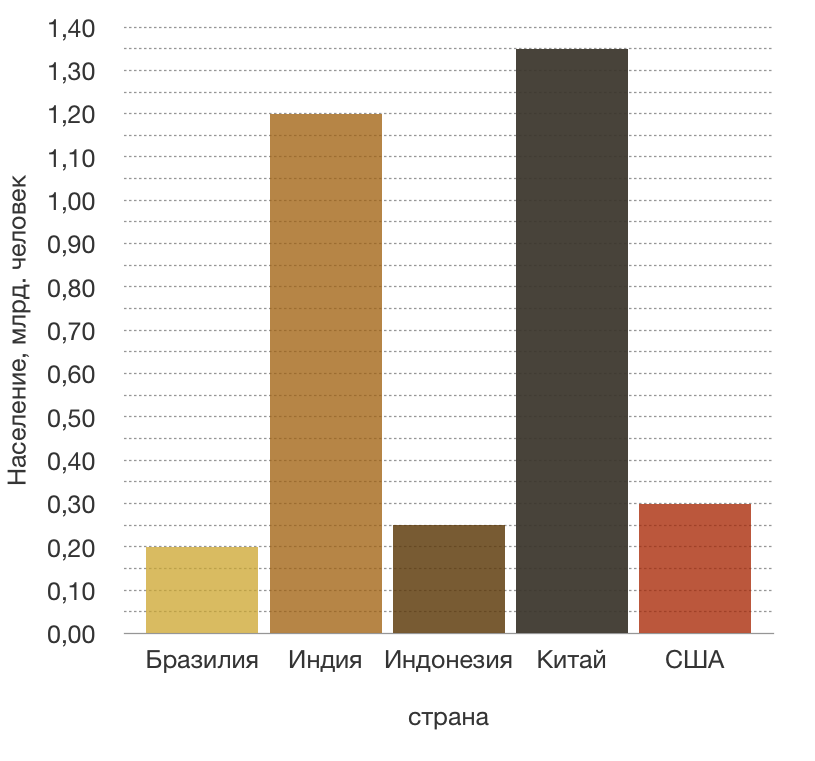 Видно, что только две страны - Индия и Китай, имеют население, численность которого больше \(\displaystyle 1,00\) миллиарда человек: численность населения Индии составляет \(\displaystyle 1,20\) миллиарда человек, а Китая - \(\displaystyle 1,35\) миллиарда человек.