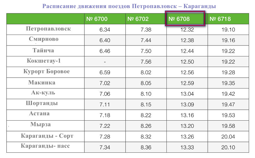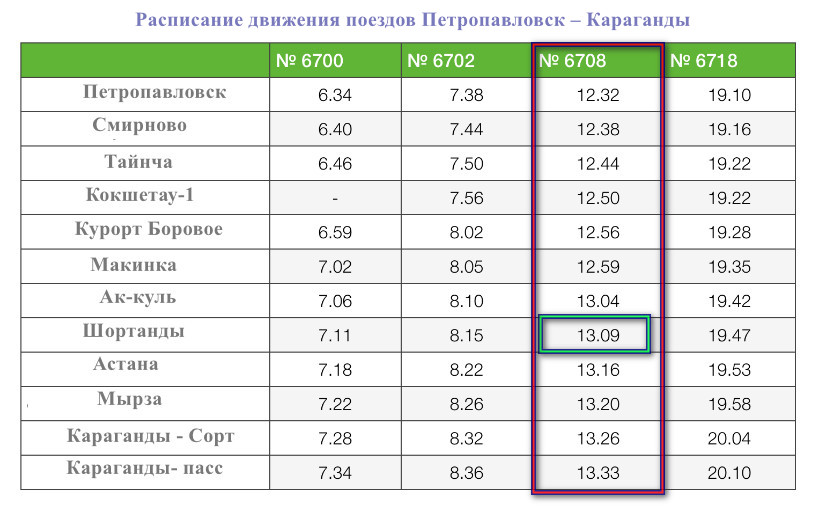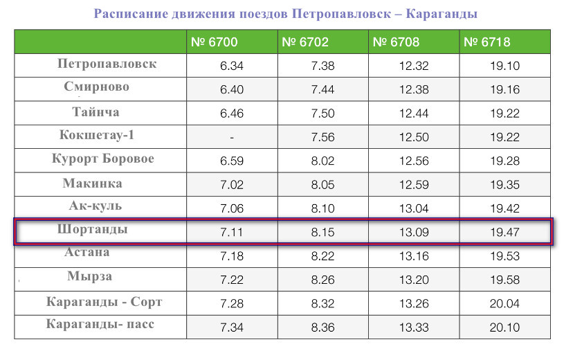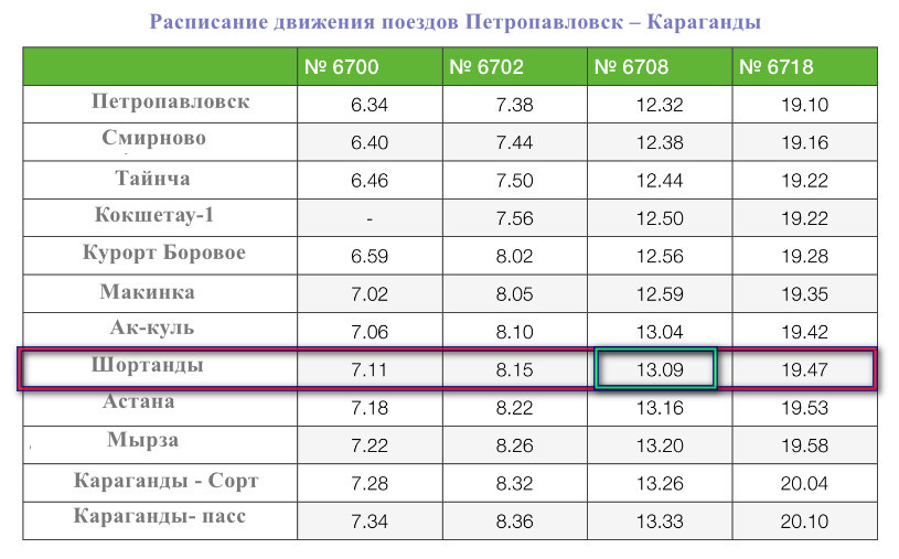 Какой поезд прибывает в поселок Шортанды в \(\displaystyle 13\) часов \(\displaystyle 9\) минут?