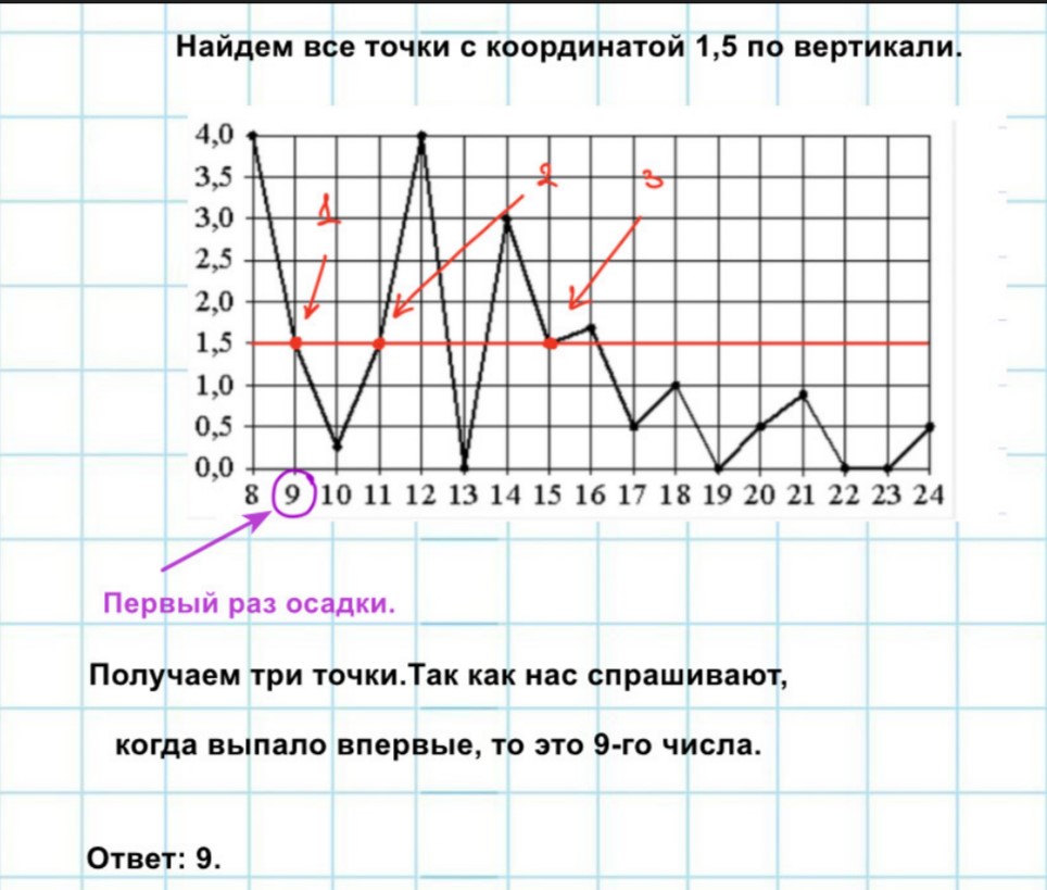На рисунке жирными точками показано суточное количество осадков, выпадавших в Актау с \(\displaystyle 8\) по \(\displaystyle 24\) января \(\displaystyle 2005\) года. По горизонтали указываются числа месяца, по вертикали количество осадков, выпавших в соответствующий день, в миллиметрах. Для наглядности жирные точки на рисунке соединены линией. Определите по рисунку, какого числа в Актау впервые выпало ровно \(\displaystyle 1{,}5\) миллиметра осадков.