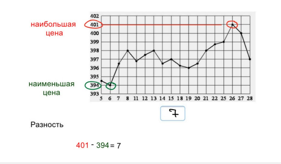 На рисунке жирными точками показана цена унции золота на момент закрытия биржевых торгов во все рабочие дни с \(\displaystyle 5\) по \(\displaystyle 28\) марта \(\displaystyle 1996\) года. По горизонтали указываются числа месяца, по вертикали цена унции золота в долларах США. Для наглядности жирные точки на рисунке соединены линией. Определите по рисунку разность между наибольшей и наименьшей ценой золота на момент закрытия торгов в указанный период (в долларах США за унцию).