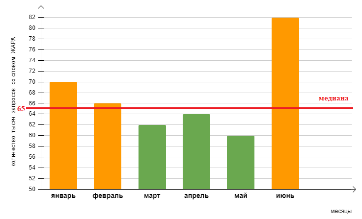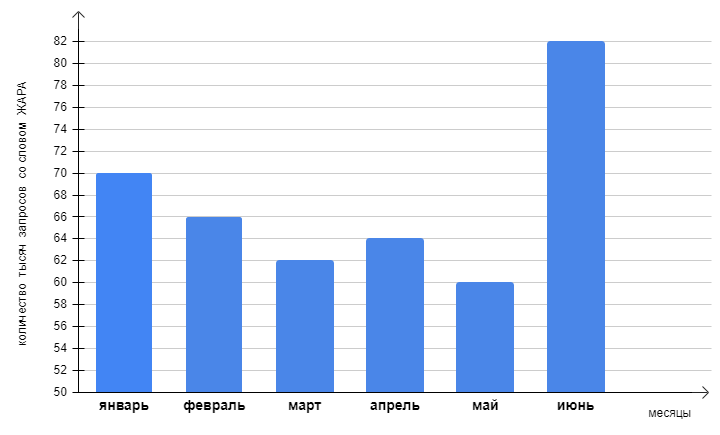 Количество запросов со словом ЖАРА, сделанных на поисковом сайте Yandex.ru в первом полугодии \(\displaystyle 2009\) года представлены в виде столбчатой диаграммы: