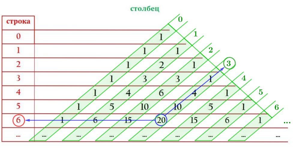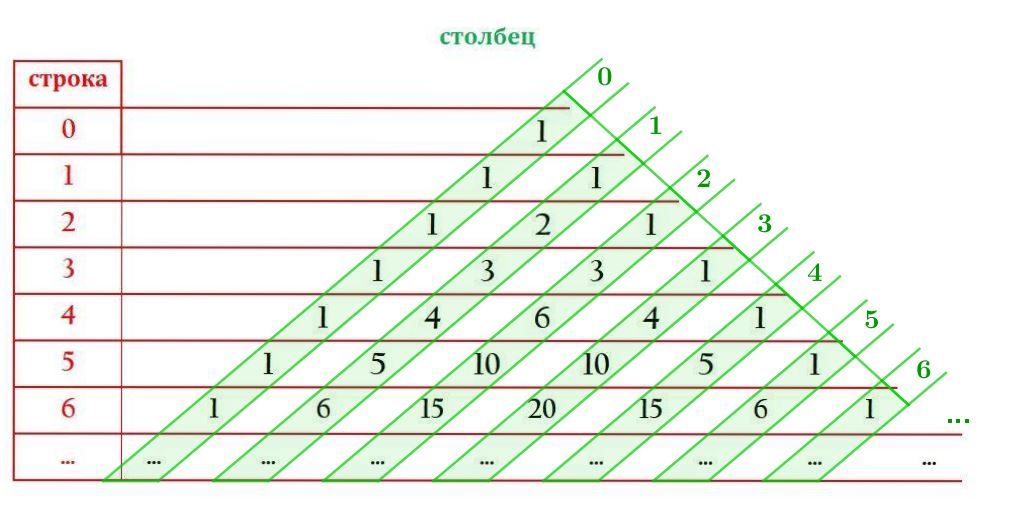 - Строки и столбцы в треугольнике Паскаля нумеруются, начиная с нуля: \(\displaystyle 0{\small ,} \, 1{\small ,} \,2{\small ,} \, \ldots\)
