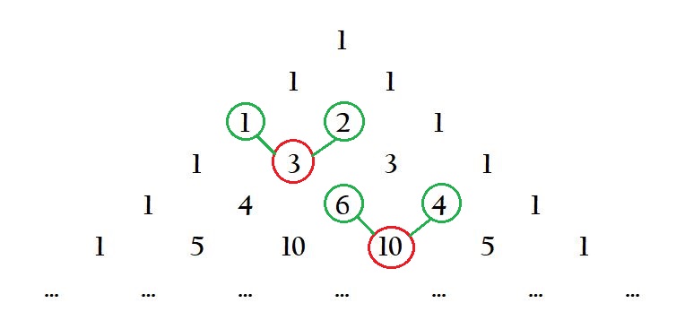 Например, выделенное число \(\displaystyle 3\) равно сумме стоящих выше \(\displaystyle 1\) и \(\displaystyle 2{\small:}\) \(\displaystyle 3=1+2{\small,}\) \(\displaystyle 10\) получено как сумма \(\displaystyle 6\) и \(\displaystyle 4\) и так далее.