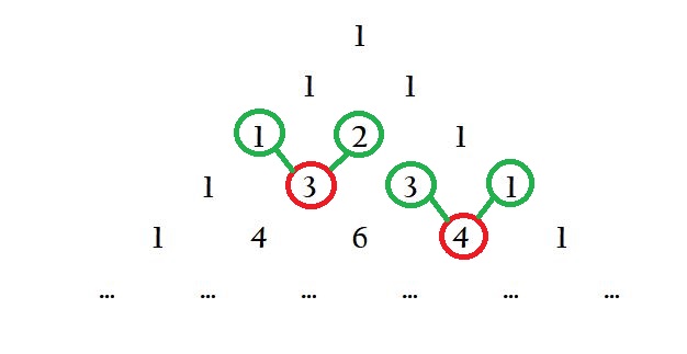Например, выделенное число \(\displaystyle 3\) равно сумме стоящих выше \(\displaystyle 1\) и \(\displaystyle 2{\small:}\) \(\displaystyle 3=1+2{\small,}\) \(\displaystyle 4\) получено как сумма \(\displaystyle 3+1\) и так далее.