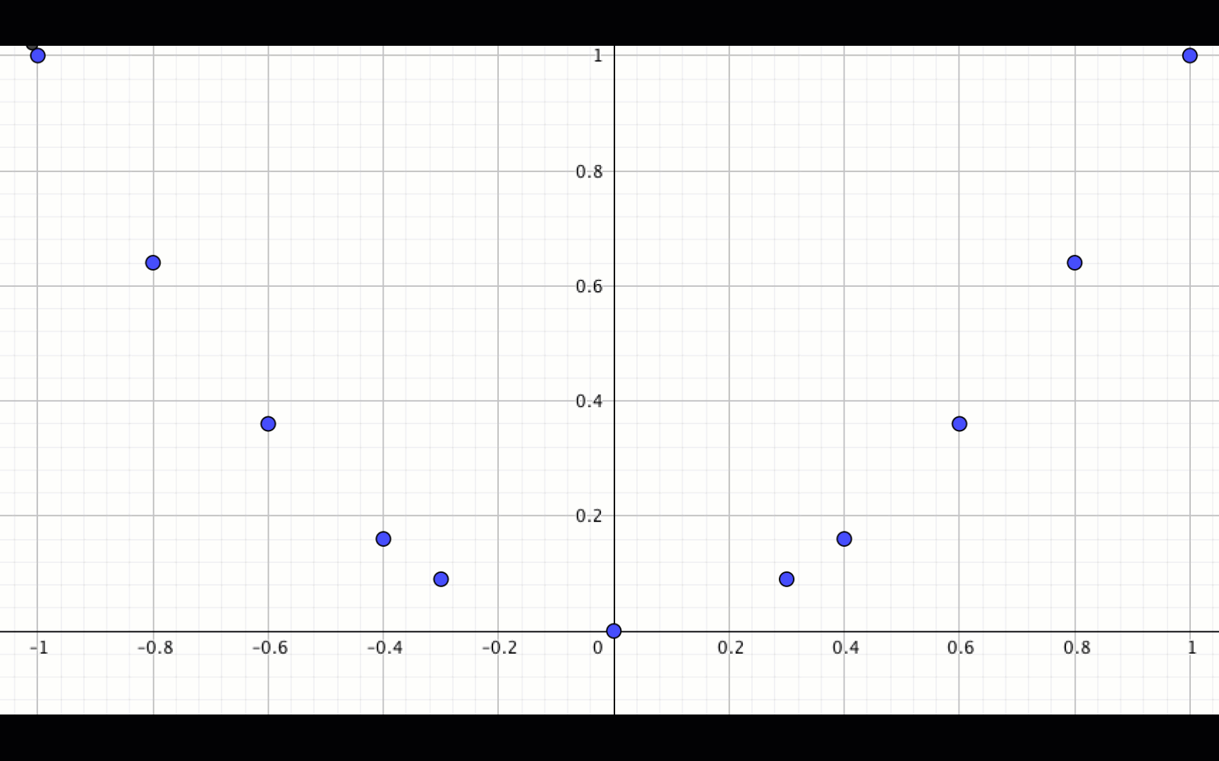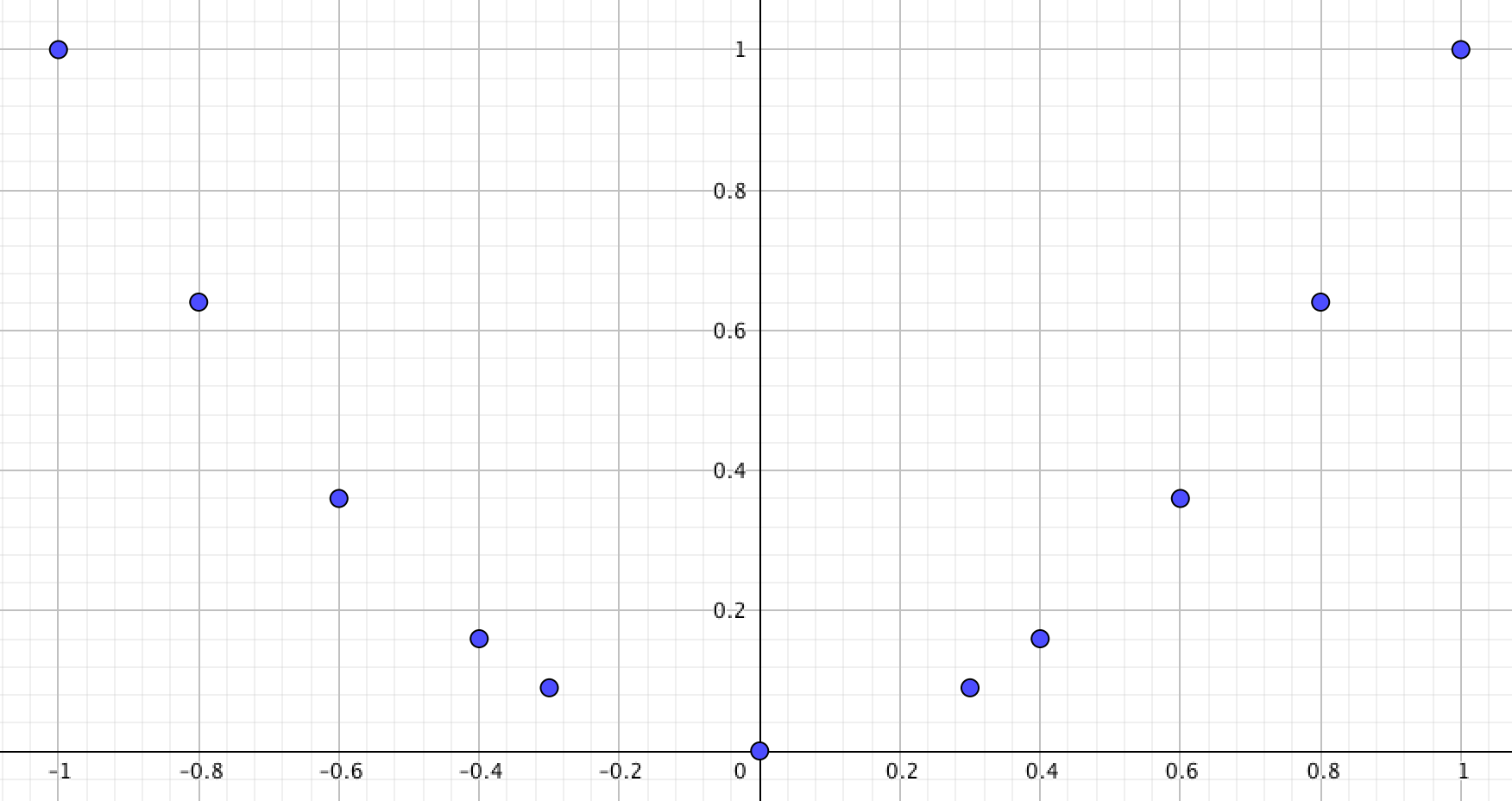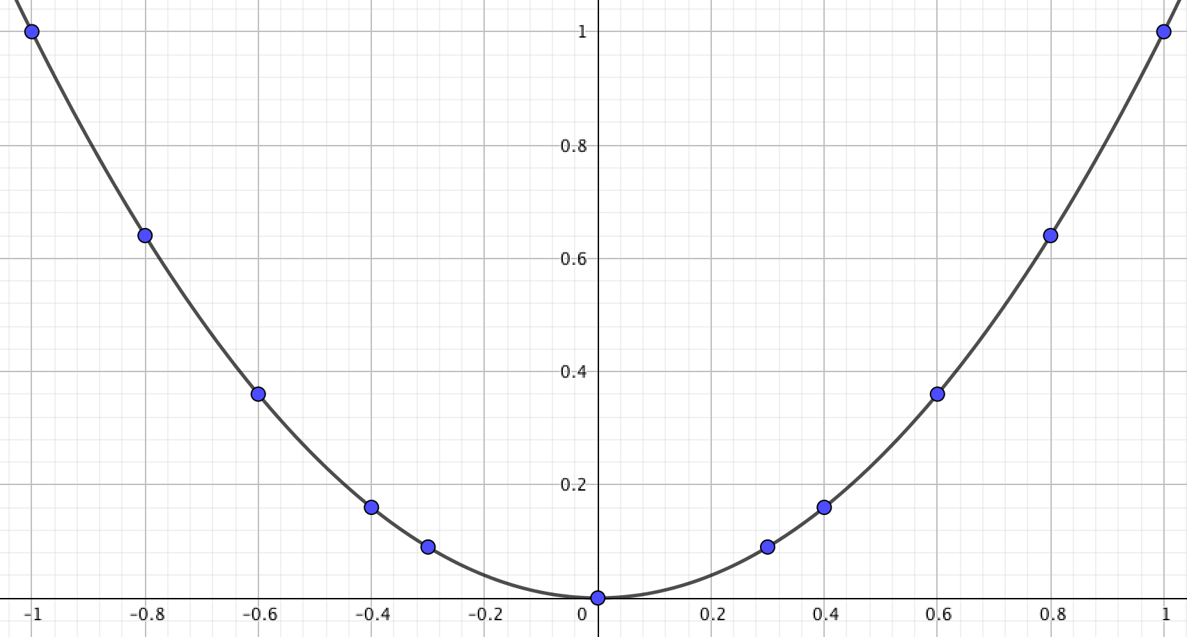 | \(\displaystyle \small y=x^2\) | \(\displaystyle \small \small (-1)^2\) | \(\displaystyle \small (-0{,}8)^2\) | \(\displaystyle \small (-0{,}6)^2\) | \(\displaystyle \small (-0{,}4)^2\) | \(\displaystyle \small (-0{,}3)^2\) | \(\displaystyle \small 0\) | \(\displaystyle \small 0{,}3^2\) | \(\displaystyle \small 0{,}4^2\) | \(\displaystyle \small 0{,}6^2\) | \(\displaystyle \small 0{,}8^2\) | \(\displaystyle \small 1^2\) |